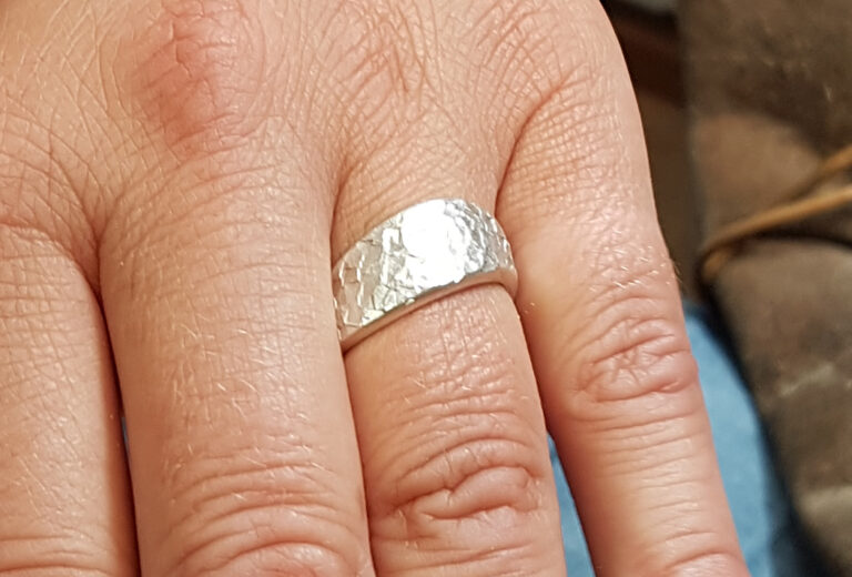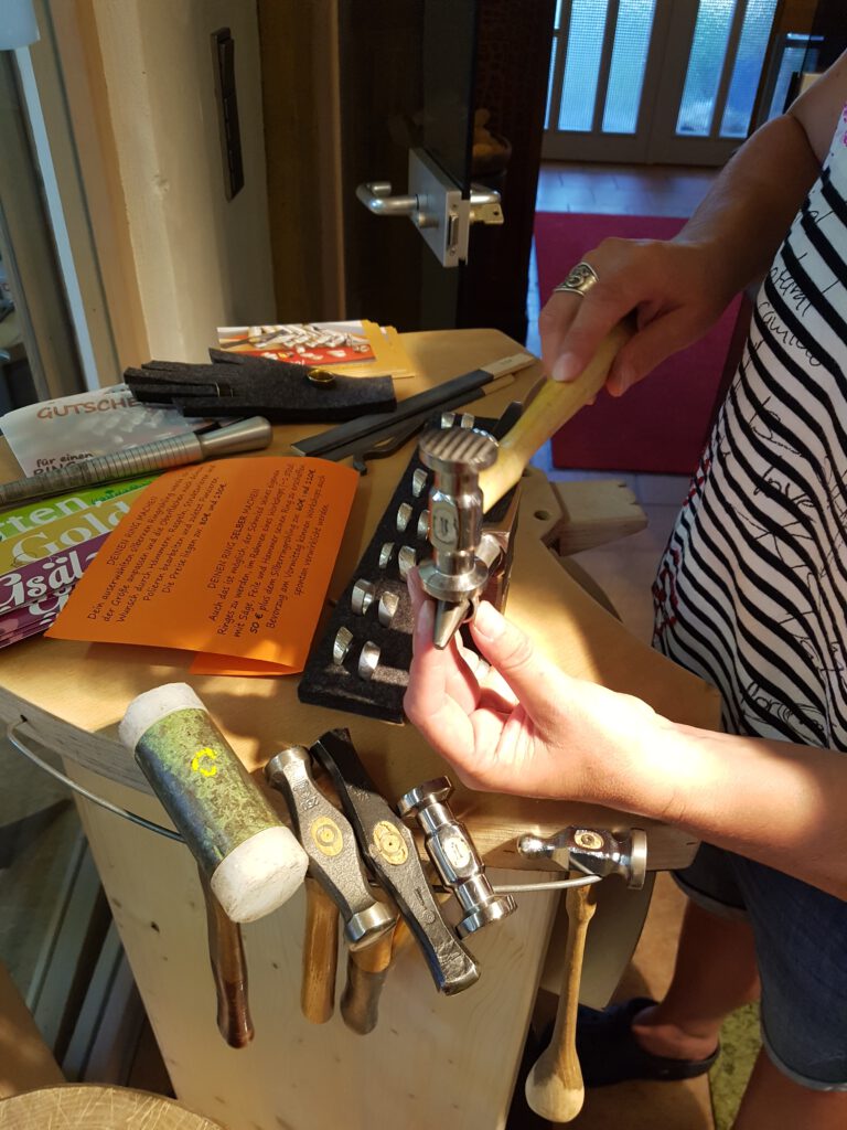 Wir machen den Ring gemeinsam. Hier in unsere Goldschmiede im Fabrikle schmiedest Du selbst Deine Wunschoberfläche. Dein Tun prägt das einzigartige Ergebnis ! Wir kümmern uns noch um ein schönes Finish des Ringes und dazu brauchen wir kaum mehr als 1 Stunde.
