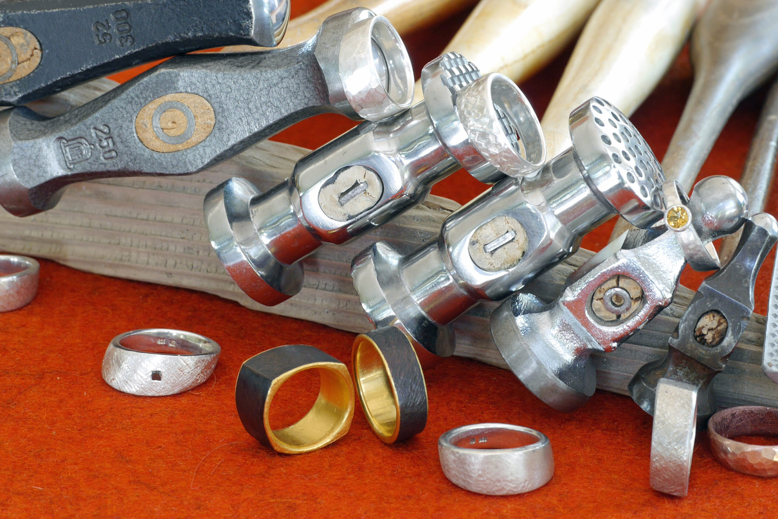 RING to go! …ist die spontane Anfertigung eines silbernen, zudem natürlich ergonomischen Ringes. Die Zutaten: einige Hämmer, viele bereits gegossene Ringrohlinge aus 925er Silber, und Freude am eigenen Tun….