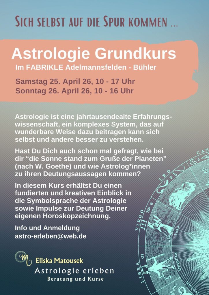Kategorisiert als Veranstaltungen Fabrikle Verschlagwortet mit Astrologie, Eliska Matousek, Fabrikle, Grundkurs, Seminar, Workshop